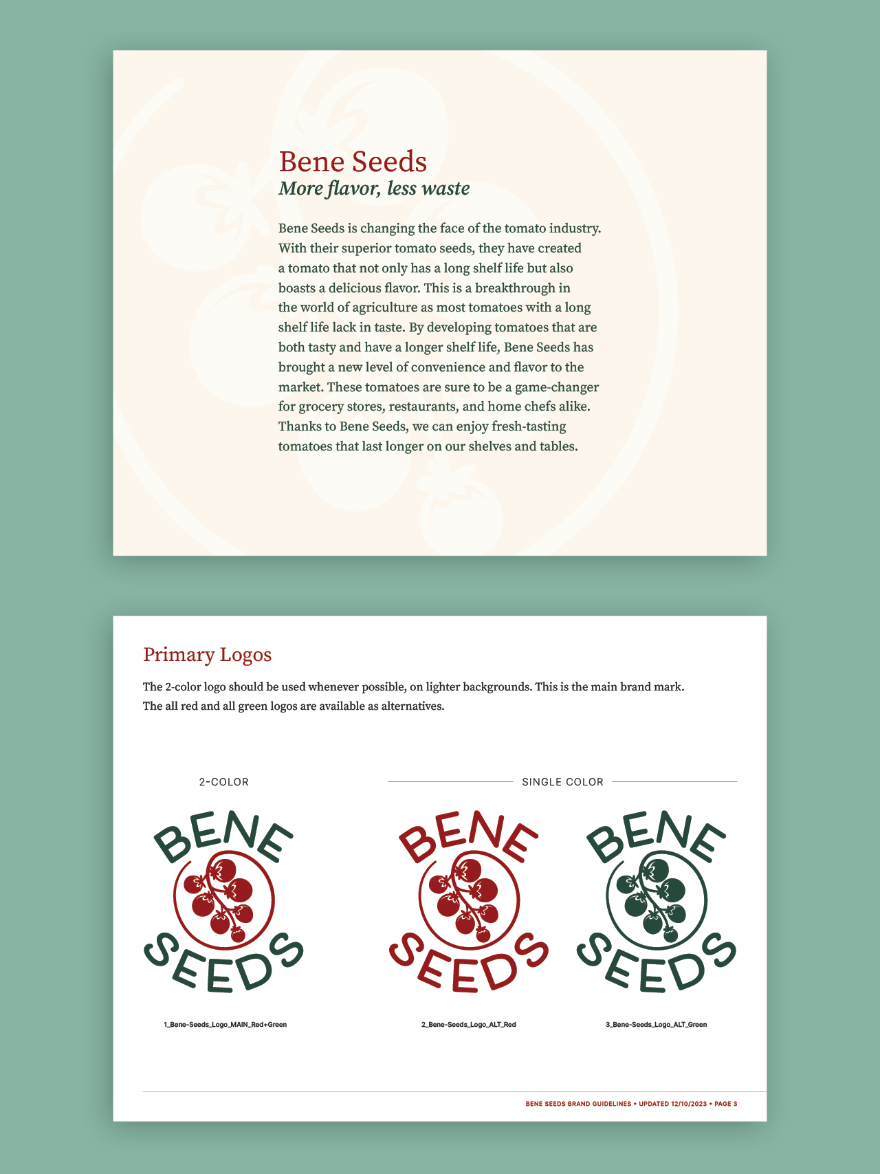Bene Seeds is founded by scientists who love to cook. They have developed tomatoes that have both great taste and a long shelf life. Because they are selling seeds to farms, their need was minimal: branding and a simple packaging solution for the seeds.