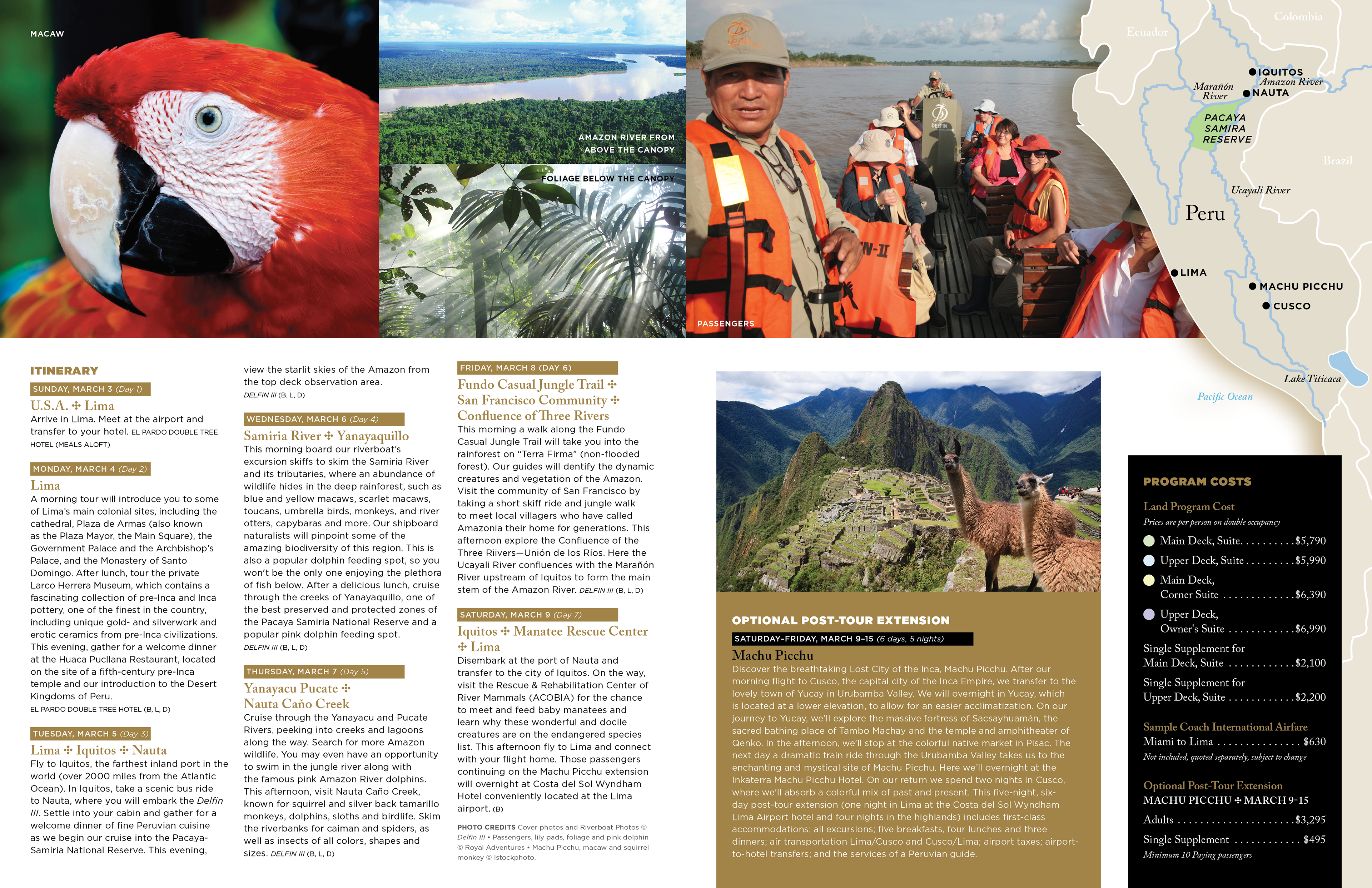 (Left) Itinerary and pricing, double-page spread from a Peru tour. (Right) Animated gif showing all eight pages of a culture tour in Mexico.